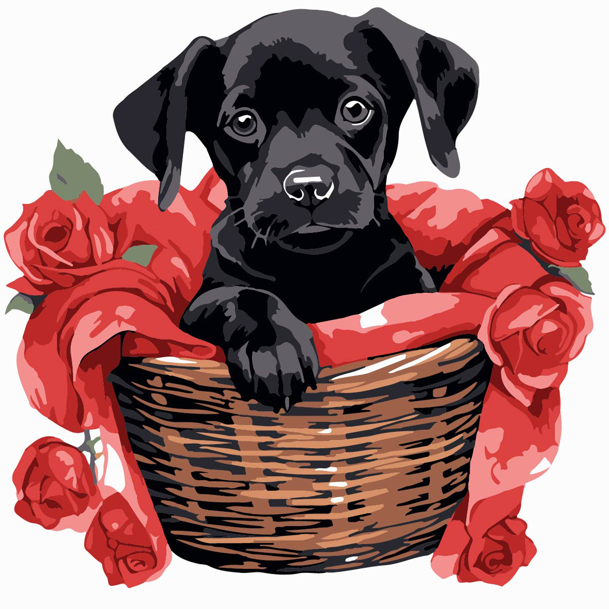 Картина за номерами Strateg Чорне щеня з трояндами розміром 20х20 см (HH8010)