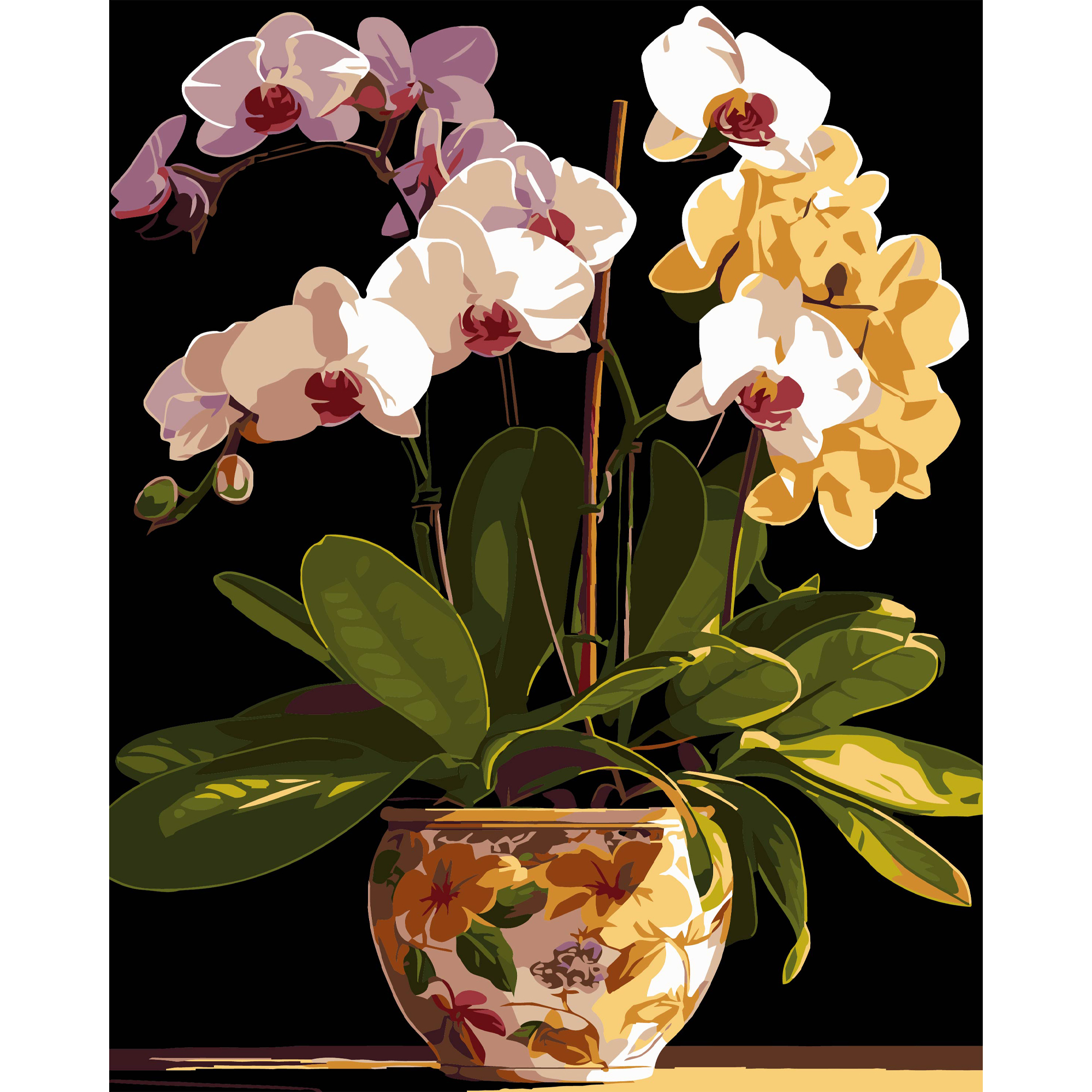 Картина за номерами Strateg ПРЕМІУМ Вазон орхідей на чорному фоні розміром 40х50 см (AH1198)