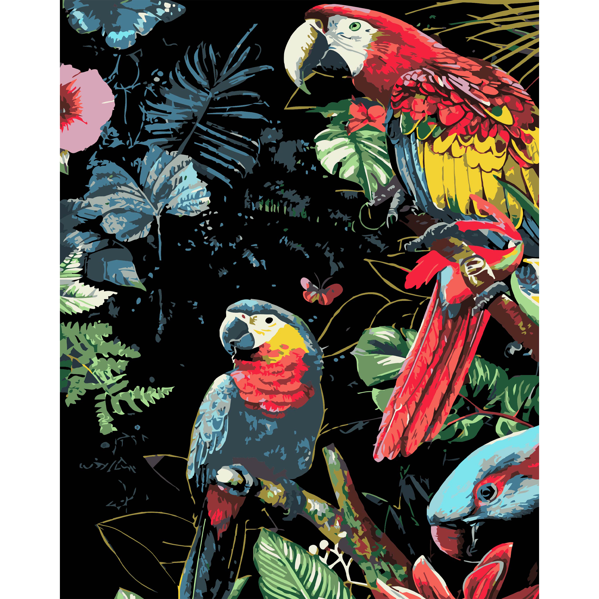 Яскраві папуги на чорному фоні розміром 40х50 см (AH1201-19)