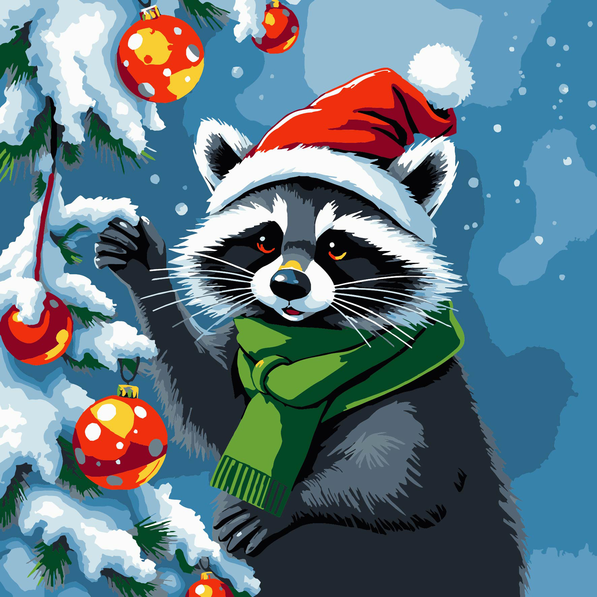 Картина за номерами Strateg ПРЕМІУМ Єнот прикрашає ялинку з лаком та з рівнем розміром 30х30 см (ES-0898)