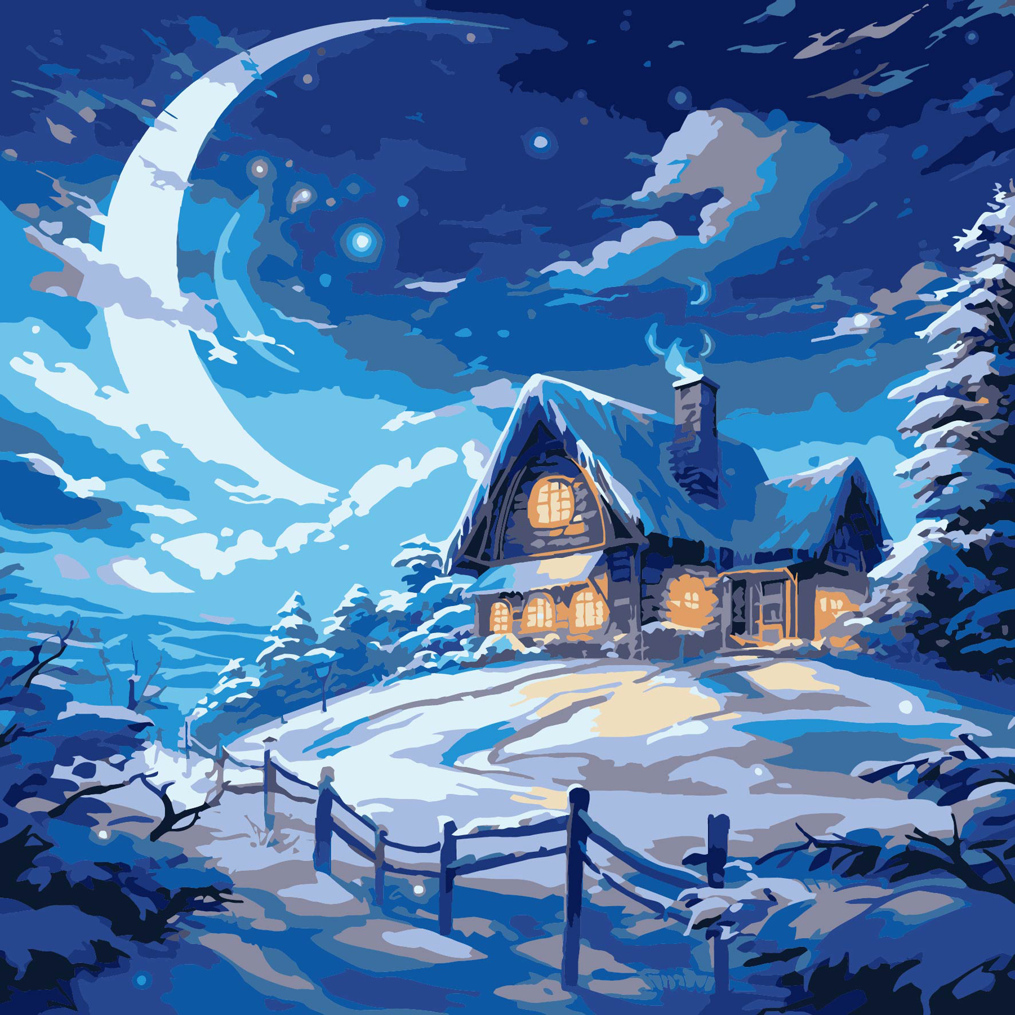 Картина за номерами Strateg ПРЕМІУМ Зимова хатинка з лаком та з рівнем розміром 30х30 см (ES-0900)